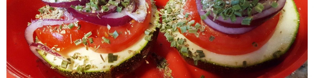 - Die Zuchhini in der mitte auseinanderschneiden mit Tomatenscheiben belegen und Zwiebelringe oben drauf geben. Mit Schnittlauch, Pfeffer und Salz würzen