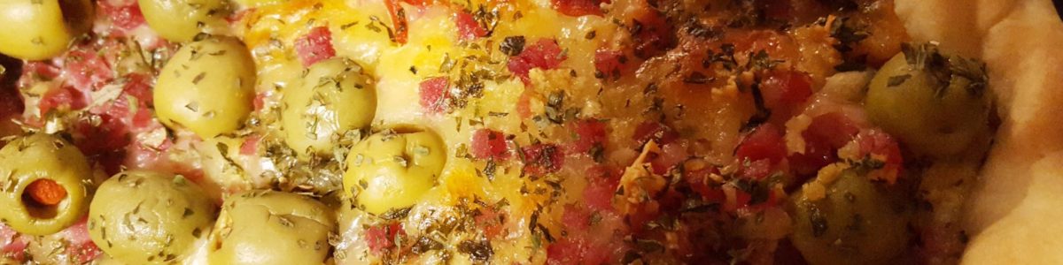 - Schinkenwürfel und Olivenöl auf den Teig geben mit den beiden Käse belegen