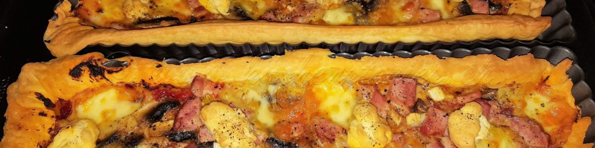 Anstelle von Blätterteig könnt ihr natürlich auch Pizzateig verwenden. Den Ofen dann auf 240° vorheizen.