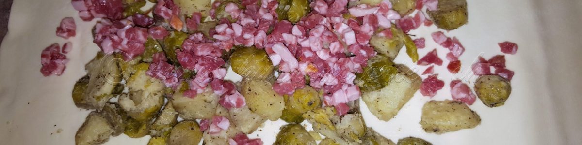 - Gegarte Rosenkohlröschen, Kartoffeln und Speck darauf verteilen.