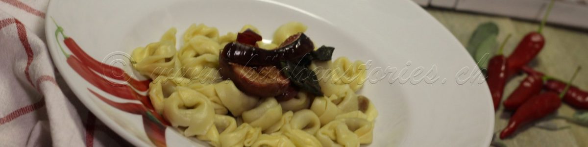 - Die fertigen Tortellini abgiessen, auf Tellern anrichten und mit der Sauce vermischen.