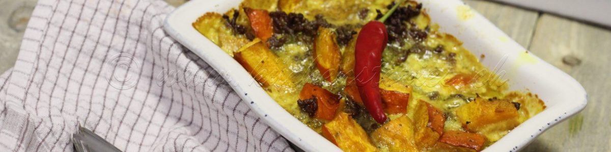 - Über die Masse verteilen und bei 180° Ober- und Unterhitze für ca. 30 Minuten backen (bis der Kürbis noch leicht bissfest ist).