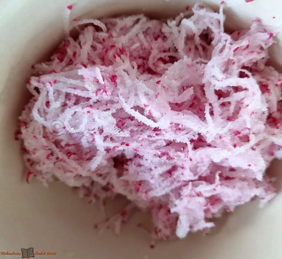 - Die Radieschen putzen und mit einem Hobel oder einer Küchenmaschine klein schneiden. Danach salzen und für ca. 30 Minuten beiseite stellen