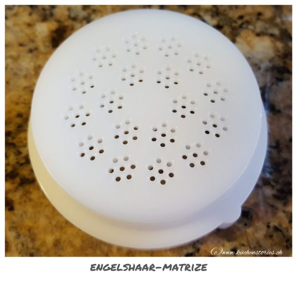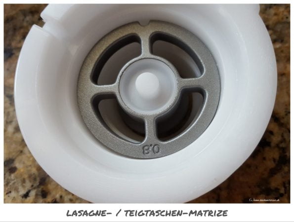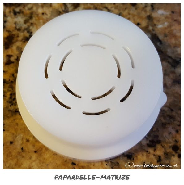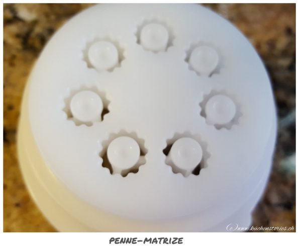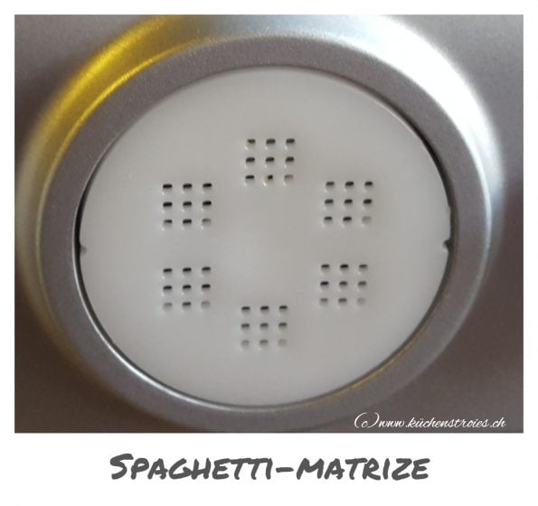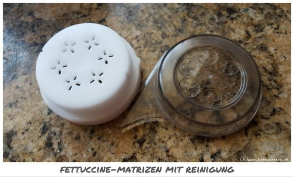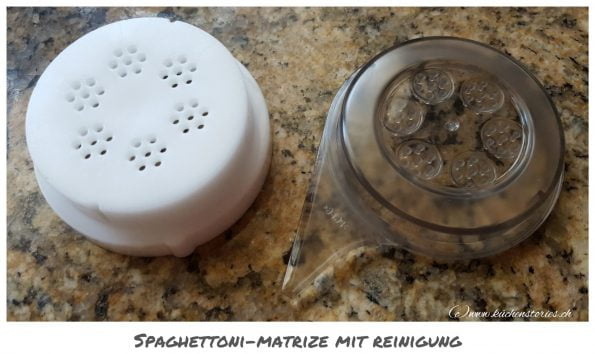 Die Spaghetti-Matrize ist beim Kauf bereits im Gerät eingebaut, deshalb habe ich es auch genau so fotografiert 😉 Auch für diese gibt es einen Reinigungsaufsatz.